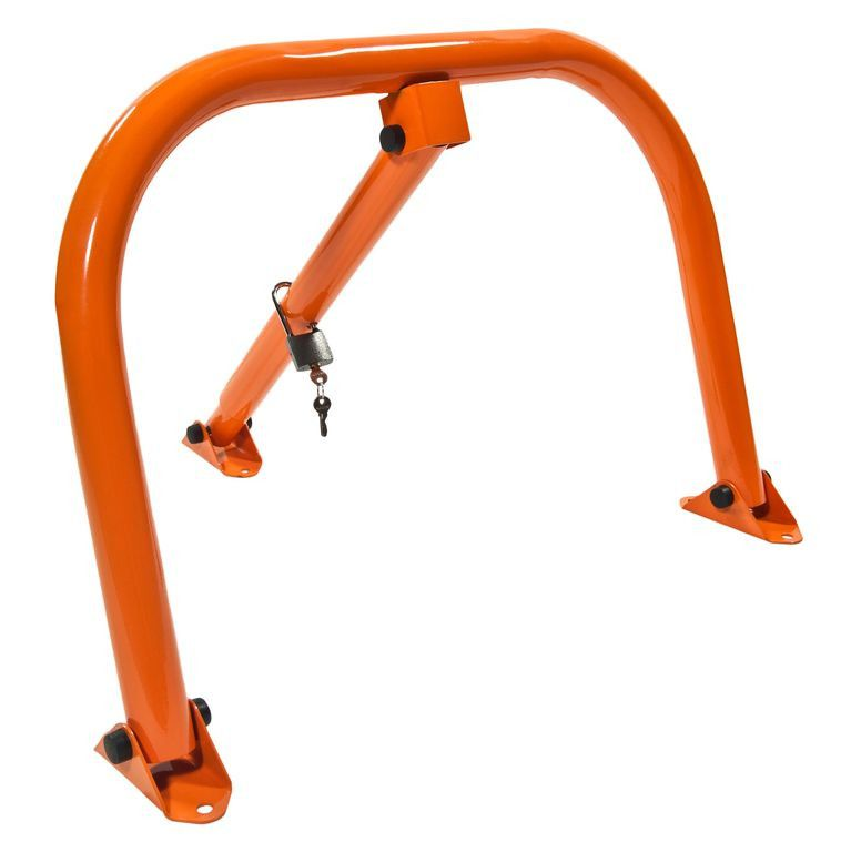 конструктивно блокиратор парковочного места представляет собой п-образный каркас из металлической трубы диаметром 38 мм и 45 мм с телескопической «ножкой»-опорой посередине. в исходном вертикальном положении он служит препятствием для несанкционированной парковки. для обеспечения проезда владельцу достаточно опустить конструкцию горизонтально. фиксация положения блокиратора осуществляется обычным навесным замком.